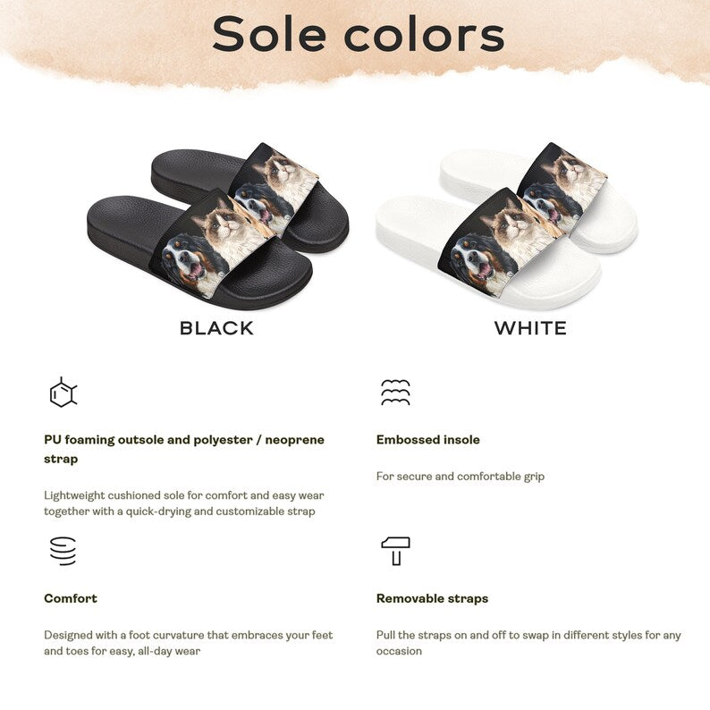 Introducing our highly customized Pet Photo Sandals, where your beloved furry friend takes center stage in a delightful and artistic design! These sandals are meticulously crafted with top-notch materials and thoughtful features, providing the ultimate blend of comfort, durability, and personalization for all your adventures and playful pursuits.