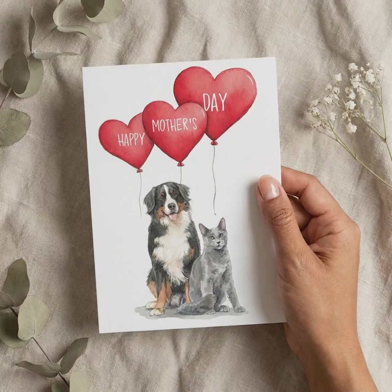 The design includes 3 heart-shaped balloons with “Happy Mother’s Day” written on them, making this card both emotional and joyful — perfect for honoring the bond between a pet and their mom.