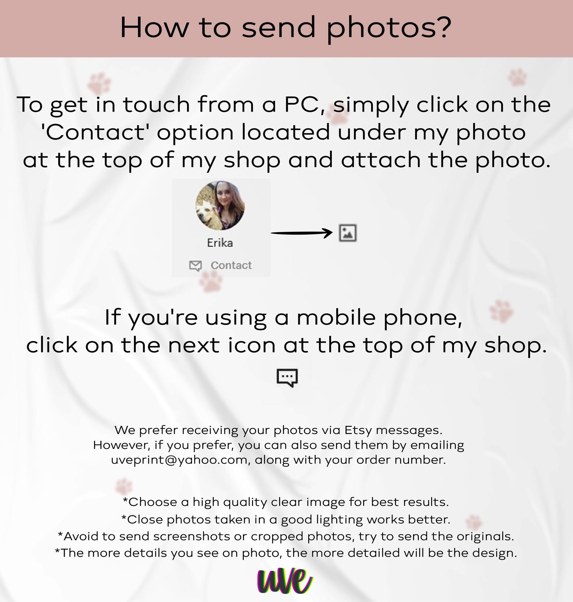 3. Send us a message with your pet's photo once the order is placed. We will need your order number as well. You can send us several photos, and we will choose the one that works best.